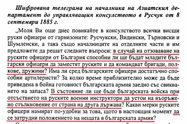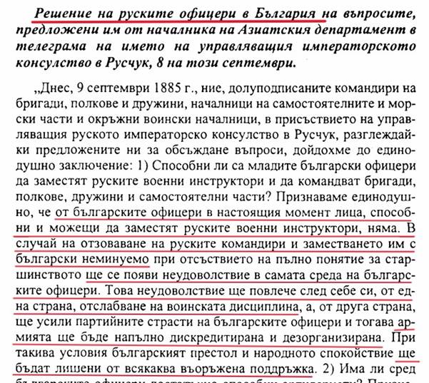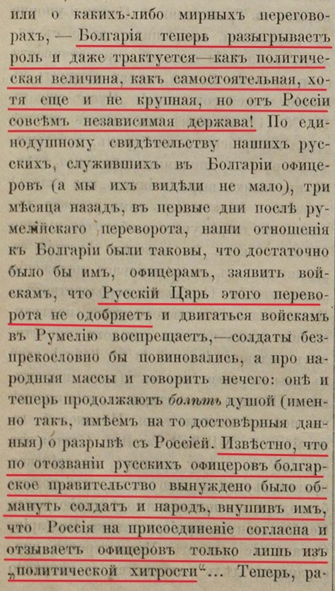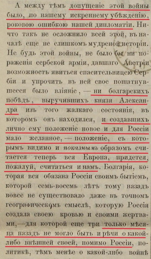 „А междувременно, допускането на тази война беше, по наше искрено убеждение, фатална грешка на нашата дипломация. Нищо не е усложнило повече цялата тази, първоначално доста проста история. Ако не беше тази война, нямаше да има нито поражение на сръбската армия, което даде възможност на Австрия да стане спасител на Сърбия и да засили колебаещото се влияние там, нито българските победи, които спасиха княз Александър от жалкото състояние, в което се намираше, и създадоха за него лично нова и малко желана ситуация за Русия – ситуация, с която цяла Европа сега видимо и демонстративно се съобразява, може би ще трябва да се съобразяваме и ние. – „България, която дължи съществуването си изцяло на Русия, която преди седем или осем години дори не съществуваше в точния географски смисъл, който Русия създаде със своята кръв и жертви — за която само преди три месеца не можеше да се говори за никаква външна политика без Русия, още по-малко за някаква война или каквито и да било мирни преговори — България сега играе ролята и дори се третира като политическа единица, като самостоятелна, макар и все още не голяма, но напълно независима от Русия, сила! Според единодушните показания на нашите руски офицери, служещи в България (а видяхме доста от тях), преди три месеца, в първите дни след Румелийския преврат, нашите опити срещу България бяха толкова нетактични, че би било достатъчно за нас, офицерите, да заявим на войските, че руският цар не одобрява този преврат и забранява на войските да се придвижват в Румелия – войниците щяха да се подчинят безпрекословно, а за масите няма какво да се каже: те все още продължават да се молят в сърцата си (точно така, имаме достоверни данни за това) за скъсване с Русия. Известно е, че след отзоваването на руските офицери, българското правителство беше принудено да заблуди войниците и народа, като ги убеди, че Русия се е съгласила с въстанието и отзовава офицерите само от „политическа хитрост“… Сега, разбира се, властта на българите е изцяло в ръцете на княз Александър.“