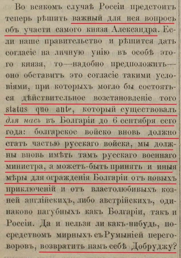 „Във всеки случай, Русия сега трябва да реши важния за нея въпрос за съдбата на самия княз Александър. Ако нашето правителство реши да се съгласи на лична уния в лицето на този княз, тогава – трябва да предположим – то ще постави това съгласие с условия, които биха позволили реално възстановяване на статуквото ante, което е съществувало за нас в България преди 6 септември тази година: българската армия трябва отново да стане част от руската армия, трябва отново да имаме руски военен министър там и може би да вземем други мерки, за да защитим България от нови авантюри и от властолюбивите машинации на англичаните или австрийците, които са еднакво пагубни както за България, така и за Русия. И не е ли възможно, чрез мирни преговори с Румъния, да ни върне Добруджа?