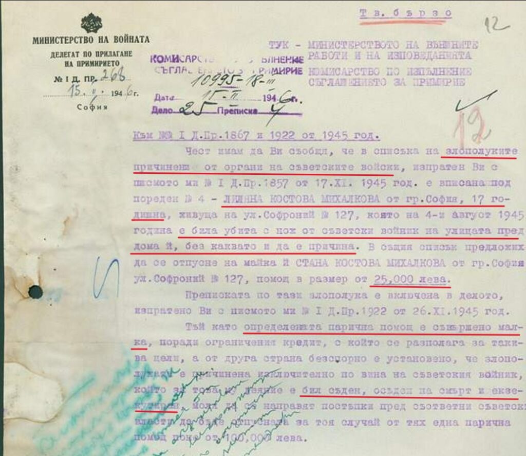 Силата на инерцията се оказа толкова непреодолима, че имаме факти за мародерство, грабежи и насилие на българска територия. Причините за това са две – политическият апарат на Червената армия не е подготвил в достатъчна степен частите на Червената армия за съществуващата в България обстановка и недостатъчно високата дисциплина, особено на тиловите части, които са твърде склонни да се занимават с плячкосване.“