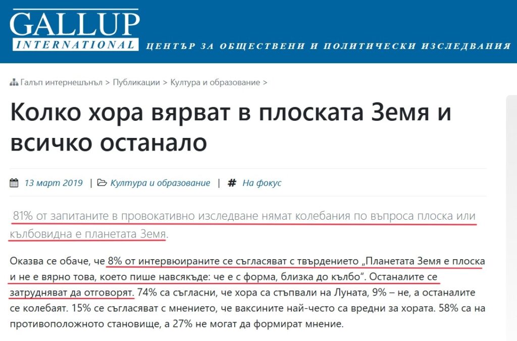 Знаете ли, че подобна анкета е правена и у нас, през 2019 г. – 81% от запитаните българи нямат колебания по въпроса плоска или кълбовидна е планетата Земя. Но останалите 19% от пълнолетните българи имат колебания по въпроса за формата на земята или не могат добре да схванат въпроса за нейната форма. То и аз понякога се чудя, на някои хора как им стига акъла да дишат? Но пък съм абсолютно сигурен, тези 19% за кого са гласували на последните избори. И на предпоследните.