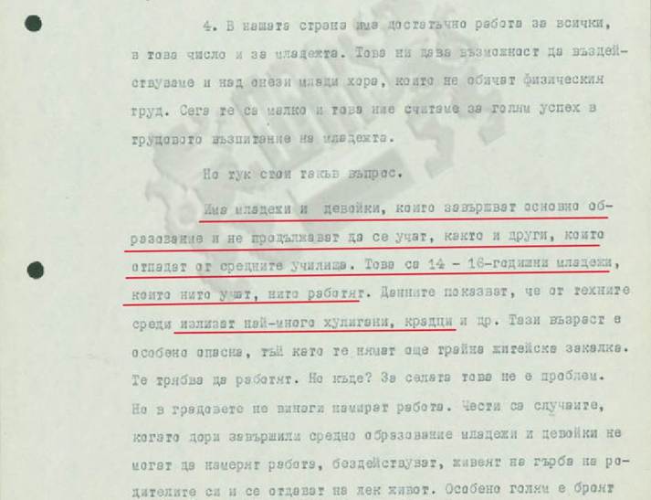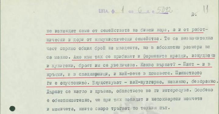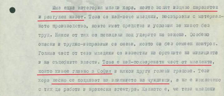 „Има една категория млади хора, които водят изцяло паразитен и разгулен живот. Това са най-вече младежи, несвързани с материалното производство, които имат средства и условия за живот без труд… Това е най-покварената част от младежта, която живее главно в София и някои други големи градове. Тези хора лесно се поддават на влиянието на чужденци… Жалкото е, че тези младежи не изхождат само от семействата на бивши хора, а и от работнически и дори от комунистически семейства .“