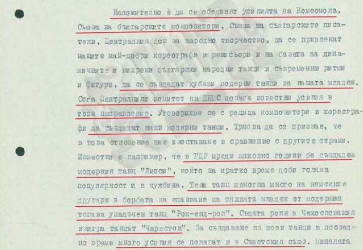 И ЦК на ДКМС се уговаря с „редица композитори и хореографи да създадат наши модерни танци.“ Защото, видиш ли, ГДР вече са ни изпреварили. Създали „модерния танц „Липси“, който дори добил голяма популярност и в чужбина. Танц, който помогнал много на немските им другари в борбата за опазване на тяхната младеж от „модерния тогава упадъчен танц „Рок-енд-рол“. А в Чехословакия същата роля изиграл танцът „Чарлстон“.