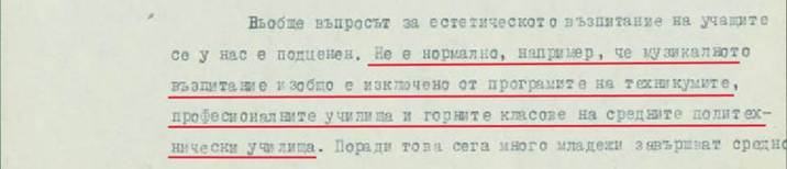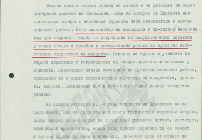 „На въпросите за естетическото възпитание на младежта дълго време Комсомолът не отделяше необходимото внимание, смяташе ги за второстепенни. … Сега вниманието на Комсомола е по-здраво насочено към два въпроса – борба за изграждане на комунистически мироглед у всеки младеж и девойка и настъпателна работа за правилно естетическо възпитание на младежта.“