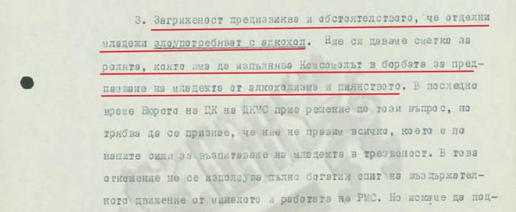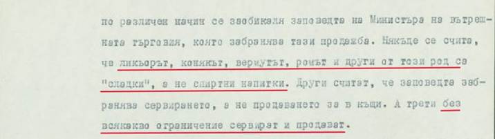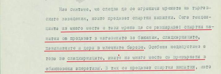 Само „отделни младежи“ злоупотребявали с алкохол. Но пък за сметка на това „мрежата“ се разширявала и алкохол се продавал навсякъде – в бакалии, в млечни барове, дори в сладкарници, които се превръщали в обикновени аперитиви, продаващи алкохол.