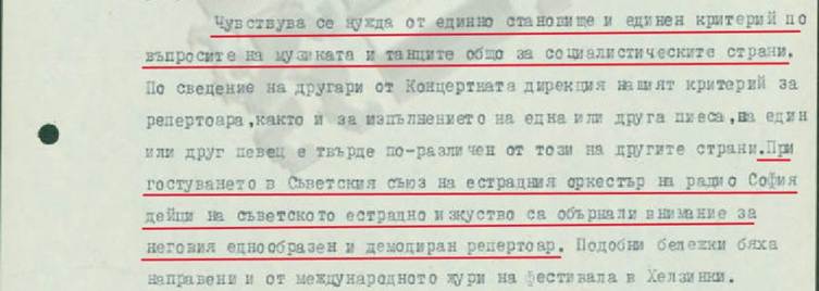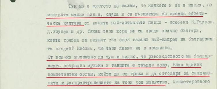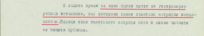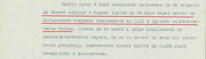 Не че съм очаквал друго, а сигурно и вие, но предложението е ясно – „до нашите подиуми и екрани трябва да се даде широк достъп на изтъкнатите естрадни изпълнители от СССР и другите социалистически страни.“ Защото „съветската естрада сега е малко позната на нашата публика.