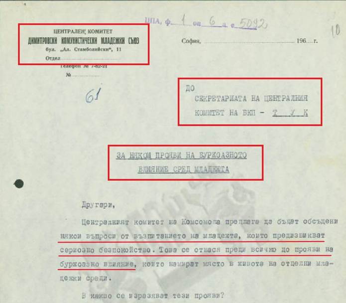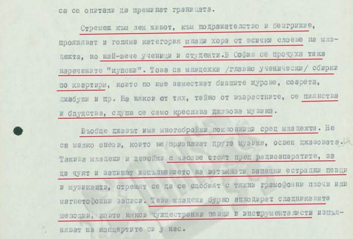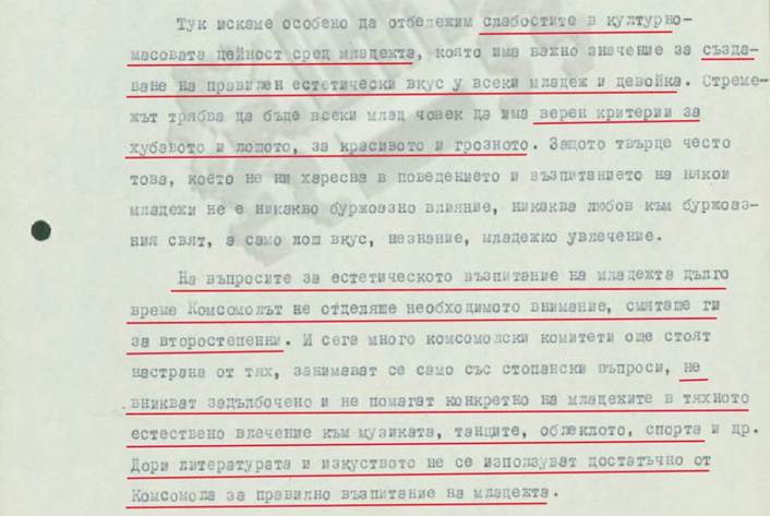 Четем доклад на ЦК на ДКМС до Секретариата на ЦК на БКП, в който младежкото крило на Компартията сериозно се обезпокоило за възпитанието на младежта и преди всичко, за „проявите на буржоазно влияние“. Явно активистите на комсомола са пропуснали някои от уроците по история или са я учили според марксистките учебници, защото в очите им, буржоазията води „изцяло паразитен и разгулен начин на живот“.