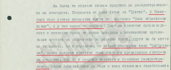 Комсомолът отчита и изоставане в създаването на нови танци – усилия за което се полагали и в Съветския съюз, където Държавният комитет по радиоразпръскването и телевизията организирал цял всесъюзен конкурс за създаване на нови танци. И специална книга издали – „Нови обществени танци“.