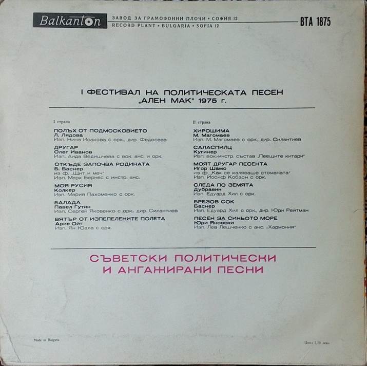 Плоча със „Съветски политически и ангажирани песни“ от I фестивал на политическата песен „Ален мак“ – 1975 (изд. Балкантон“)
