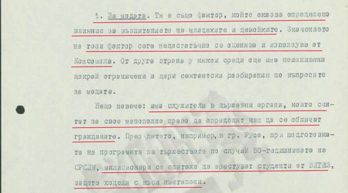 „1. За модата. Тя е също фактор, който оказва определено влияние за възпитанието на младежите и девойките. Значението на този фактор сега недостатъчно се оценява и използува от Комсомола. От друга страна у някои среди още има неизживени докрай ограничени и дори сектантски разбирания по въпросите за модата.