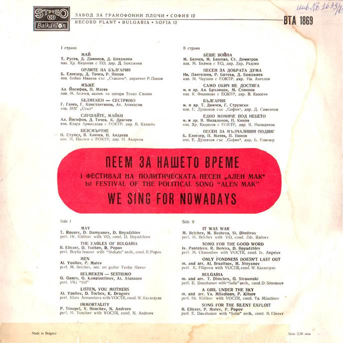Плоча „Пеем за нашето време“ от I фестивал на политическата песен „Ален мак“ – 1975 (изд. Балкантон“)