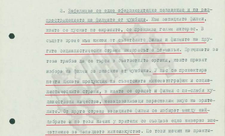 В същият документ, ЦК на ДКМС не пропуска да отбележи и „едно обезпокоително положение и по разпространението на филмите от чужбина“, а именно, че „към западните филми, които се пускали по екраните, се проявява голям интерес. В същото време към някои от съветските филми и филмите на другите социалистически страни интересът е по-малък.“