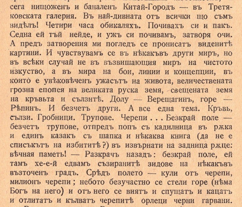 Ще направя малко лирическо отклонение. Може да ви изглежда невероятно, но един известен наш творец е видял, че и описал тази, а и други картини от Третяковската галерия:
