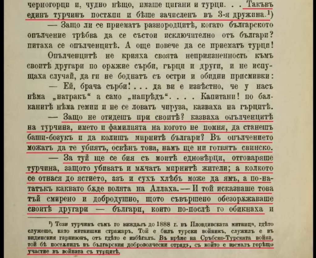 – Затуй ще се бия с моите едноверци, защото убиват и мъчат мирните жители; а колкото до ястието, аз и сух хляб може да ям, а по-нататък каквато бъде волята на Аллаха – и той казваше това тъй смирено и добродушно, щото съвършено обезоръжаваше своите другари българи, които после го обикнаха и се отнасяха с него по другарски, а особено след битките, в които нашия турчин се би със своите едноверци не по-лошо от българите.“ (стр.39) (Кисов, 1902)