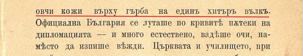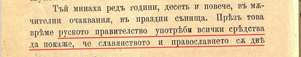 Тъй минаха ред години, десет и повече, в мъчителни очаквания, в празни сънища. През това време руското правителство употреби всички средства да покаже, че славянството и православието са две овчи кожи върху гърба на един хитър вълк. …“ (Яворов, 1904)