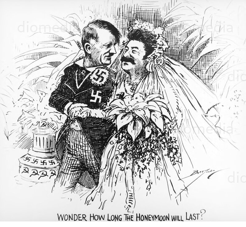 Всъщност, войната вече е „световна“, но съветските историци, а и присъдружните им глашатаи у нас, удобно забравят периода 1939-1941 г., през който Сталин и Хитлер са си приятелчета и активно си другаруват – подпомагат един друг в бъдещото разделяне на Европа! Хитлер окупира голяма част от Западна Европа, а Сталин доволно потрива ръце и чака германската армия да се изтощи достатъчно, за да я удари в гръб и да развее знамето със сърп и чук над целия континент. Дори е разочарован, че армиите на европейските държави, падащи една след друга под нацистката окупация, не оказват достатъчно сериозна съпротива, за да омаломощят немската армия. Но за разлика от Великобритания, СССР не оказва никаква помощ на нападнатите (виж Виктор Суворов – „Ледоразбивачът“). (Суворов, 1996)